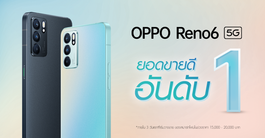OPPO Reno6 5G ที่มาภายใต้สโลแกน “อารมณ์ไหน ก็พอร์ตเทรต” ถือว่าเป็นสมาร์ทโฟนระดับกลางที่ได้รับกระแสตอบรับดีเกินคาดทั้งจากสื่อมวลชนและลูกค้าหลังจากที่เปิดตัวอย่างเป็นทางการ โดยมีข้อมูลล่าสุดจากออปโป้ ไทยแลนด์เผยว่ากวาดยอดขายดีอันดับ 1 ในตลาดสมาร์ทโฟนช่วงราคา 15,000 – 20,000 บาทภายใน 3 วันแรกที่เริ่มวางขาย การันตีกระแสแรงไม่หยุดฉุดไม่อยู่ของ OPPO Reno6 5G จากทั้งสื่อมวลชน ลูกค้า และตัวแทนจำหน่าย เป็นเสียงเดียวกันว่าคุ้มค่ากับการรอคอย และสมฐานะตัวจริงของของสมาร์ทโฟนเพื่อการถ่ายวิดีโอพอร์ตเทรตและถ่ายภาพพอร์ตเทรต