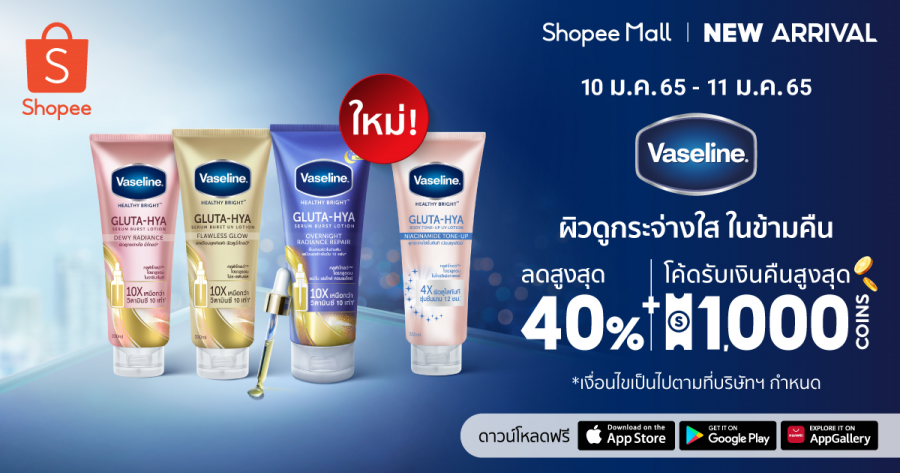กรุงเทพฯ, 10 มกราคม 2565 – “วาสลีน” ผลิตภัณฑ์บำรุงผิวภายใต้เครือ “ยูนิลีเวอร์” ผู้ผลิตสินค้าอุปโภคบริโภคที่มียอดขายสูงสุดเป็นอันดับหนึ่งของโลก แท็กทีม “ช้อปปี้” ผู้นำแพลตฟอร์มอีคอมเมิร์ซในภูมิภาคเอเชียตะวันออกเฉียงใต้และไต้หวัน มอบของขวัญปีใหม่ให้สาวๆ ด้วย ‘Vaseline Healthy Bright Gluta-Hya Overnight Radiance Repair’ ผลิตภัณฑ์ใหม่ล่าสุด ที่ต่อยอดผสานนวัตกรรมจากสองส่วนผสมเพื่อบำรุงผิวสวยมารวบรวมไว้ในหนึ่งเดียว พร้อมเข้าฟื้นบำรุงผิวกายอย่างเข้มข้นประดุจมาส์ก 10 แผ่น ให้สาวๆ ได้เอนจอยกับผิวโกลว์ใสในข้ามคืนต้อนรับศักราชใหม่ พร้อมให้เป็นเจ้าของในราคาสุดคุ้มค่าได้แล้ว บน Shopee Mall ตั้งแต่วันที่ 10 มกราคม 2565 เป็นต้นไป