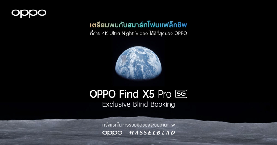 9 เมษายน 2565 (กรุงเทพฯ) – ออปโป้ เปิดจองสมาร์ตโฟนแฟลกชิปรุ่นล่าสุดใน Exclusive Blind Booking ในประเทศไทยอย่างเป็นทางการ ร่วมสัมผัสและเป็นเจ้าของ “OPPO Find X5 Pro 5G” สมาร์ตโฟนแฟลกชิปที่ร่วมพัฒนากับ Hasselblad แบรนด์กล้องระดับโลก มาพร้อมประสิทธิภาพในการถ่ายภาพและวิดีโอ 4K Ultra Night Video ได้ดีที่สุดขับเคลื่อนโดย MariSilicon X กลุ่มแรกก่อนใคร