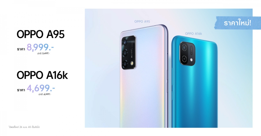 กรุงเทพฯ 26 เมษายน 2565 – OPPO A95 สุดยอดสมาร์ตโฟนให้คุณสมาร์ทไปให้สุดฟอร์ม พร้อมให้คุณได้พบกับความสนุกได้ง่ายยิ่งขึ้น พร้อมตอบโจทย์ทุกการใช้งานในราคาใหม่เพียง 8,999 บาท และ OPPO A16k ในราคาใหม่เพียง 4,699 บาท ตั้งแต่วันที่ 26 เมษายน 2565 เป็นต้นไป