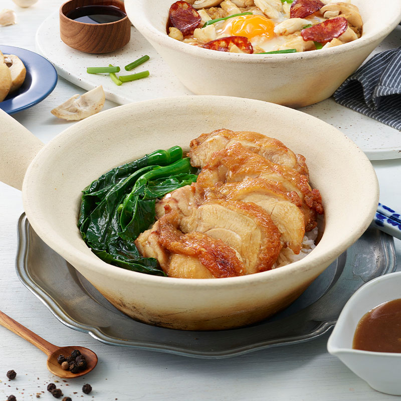 เป็นหนึ่งในเมนูอร่อยของสีฟ้าก็คือข้าวอบหม้อดินต่างๆ ขอเริ่มจาก ข้าวอบไก่กันก่อน โดยเป็นข้าวอบไก่หม้อดินที่ใช้คะน้าส่วนก้านและใบแทนหน่อไม้ฝรั่งสด นำไปผัดน้ำมันปรุงรสด้วยซีอิ๊วขาว และเหล้าจีนใส่ข้าวสวยลงในหม้อดิน วางตามด้วยคะน้าผัดน้ำมัน และไก่ทอดราดด้วยน้ำซอสที่เตรียมไว้ และตั้งไฟ ปิดฝา เมื่อร้อนได้ที่ก็พร้อมรับประทานได้ วิธีรับประทานให้อร่อย คือ ให้ปรุงรสเพิ่มด้วยแม็กกี้ (ซอสถั่วเหลือง, พริกน้ำปลามะนาวจะทำให้รสชาติไม่สมดุลและไม่อร่อย) แต่ถ้าชอบเผ็ด แนะนำให้รับประทานกับพริกขี้หนูสดเป็นเครื่องเคียง