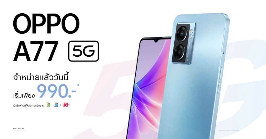 (กรุงเทพฯ – 8 กรกฎาคม 2565) OPPO A77 5G สมาร์ตโฟน 5G สเปกครบ มาพร้อมประสิทธิภาพไหลลื่น ไม่มีสะดุด ใช้งานได้เร็วแรงตลอดวัน ตอบโจทย์การใช้งานในชีวิตประจำวันอันเร่งรีบ มาพร้อมกับโปรโมชั่นสุดพิเศษด้วยราคาเริ่มต้นเพียง 990 บาท เมื่อสั่งซื้อผ่านทางผู้ให้บริการเครือข่าย AIS, dtac และ True Store จากราคาปกติ 9,999 บาท ตั้งแต่วันนี้ถึง 31 กรกฎาคมนี้