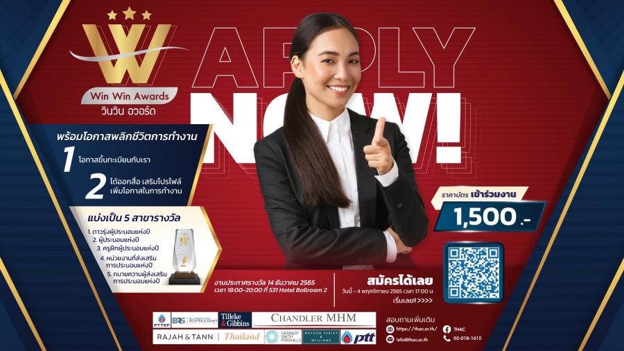 กรุงเทพฯ ประเทศไทย – “สถาบันอนุญาโตตุลาการ” (Thailand Arbitration Center) หรือ THAC สถาบันให้บริการด้านการอนุญาโตตุลาการ และการประนอมข้อพิพาทในระดับสากล จัดการประกวดผลงานชิ้นโบว์แดงของ “ผู้ประนอม” ทั่วไทย ชิงรางวัล “Win Win Awards” (วินวิน อวอร์ด) สุดยอดรางวัลแห่งปีของวงการนักไกล่เกลี่ย ประกาศรับสมัครแล้วตั้งแต่วันนี้ – 4 พฤศจิกายน 2565 เตรียมพร้อมจัดงานประกาศรางวัลครั้งยิ่งใหญ่ 14 ธันวาคม 2565 นี้