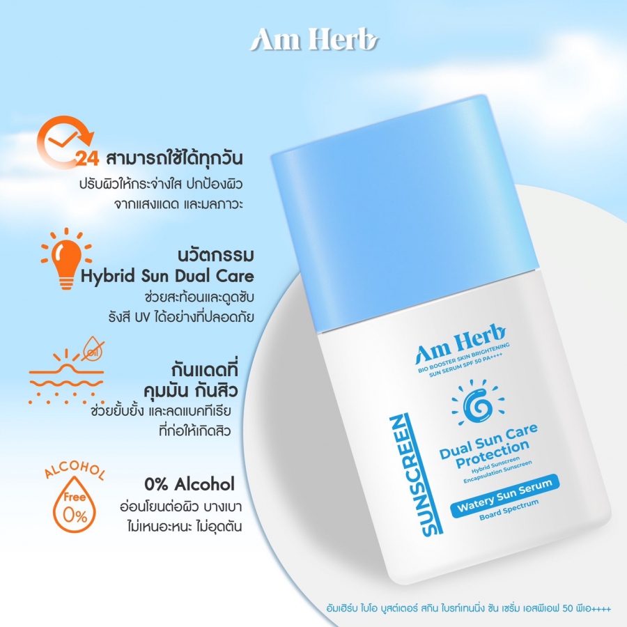 กันแดดสบายผิว บางเบาพร้อมการปกป้องและบำรุงที่เกินร้อย กับผลิตภัณฑ์ อัมเฮิร์บ ไบโอ บูสต์เตอร์ สกิน ไบรท์เทนนิ่ง ซัน เซรั่ม เอสพีเอฟ 50 พีเอ++++ เซรั่มกันแดดบูสเตอร์ ใหม่!! กันแดดเนื้อน้ำสัมผัสบางเบา ซึมไว ดุจเซรั่ม บูสผิวใส สูตรบางเบาดุจน้ำ สบายผิว กันแดดได้เต็มประสิทธิภาพ เหมาะกับสำหรับผิวมัน เป็นสิว ผิวแพ้ง่าย พร้อมช่วยบำรุงผิวให้กระจ่างใส ปกป้องผิวจากแสงแดด และมลภาวะ ฟื้นฟูผิวที่ถูกทำร้ายด้วยแสงแดด และปกป้องผิวสวย ประสิทธิภาพสารกันแดดทรงประสิทธิภาพ HYBRID SUN DUAL CARE PROTECTION สารกันแดดรุ่นใหม่ที่สะท้อนรังสีได้อย่างเหนือชั้น และดูดซับรังสี UV ได้อย่างปลอดภัย