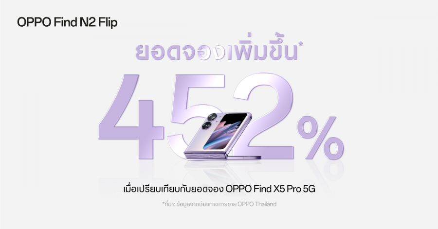 25 มีนาคม 2566 กรุงเทพฯ – เปิดตัวแรง ยกระดับวงการสมาร์ตโฟนจอพับไปอีกขั้น! OPPO Find N2 Flip สมาร์ตโฟนจอพับรุ่นแรกจาก OPPO ที่มาในสโลแกน “พับที่ดีกว่า” ด้วยดีไซน์หน้าจอด้านนอกที่ใหญ่ที่สุดในอุตสาหกรรม ให้ใช้งานได้มากขึ้น ตอบโจทย์ทุกการใช้งาน เรียกว่าเขย่าวงการสมาร์ตโฟนจอพับ กวาดยอดจองสูงเพิ่มขึ้นจากรุ่นก่อนถึง 452% ได้รับกระแสตอบรับที่ดีเยี่ยมจากสื่อมวลชนและผู้บริโภคว่าเป็นสมาร์ตโฟนที่ตอบโจทย์การใช้งานในทุกด้าน ก้าวไปอีกขั้นของการใช้งานสมาร์ตโฟนจอพับ พร้อมวางจำหน่ายอย่างเป็นทางการแล้ววันนี้ในราคา 29,990 บาท ที่ OPPO Brand Shop ทุกสาขาและตัวแทนจำหน่ายทั่วประเทศ หรือผ่านผู้ให้บริการเครือข่ายลดสูงสุด 11,000 บาท ตั้งแต่วันนี้ – 30 เมษายน 2566