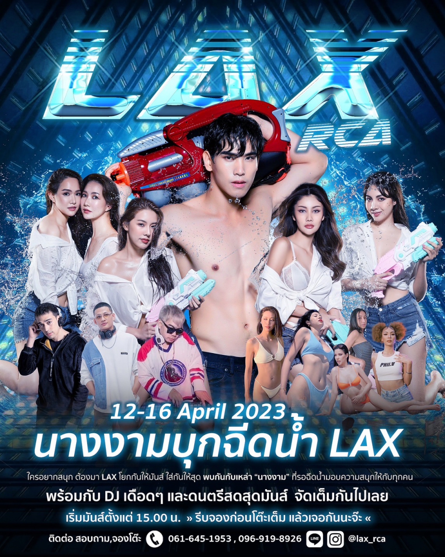 LAX RCA ร้านอาหารชื่อดังที่สุดในย่าน RCA ที่ เตรียมจัดงานใหญ่ “Songkran Thailand’s Water Festival LAX RCA” ต้อนรับความสนุก ในเทศกาลสงกรานต์ ระหว่างวันที่ 12-16 เมษายน 2566 พร้อมยกทัพเหล่า “นางาม” จากเวทีต่างๆ มาร่วมสร้างความบันเทิง อาทิ โจอี้ อรวิภา กนกนทีสวัสดิ์ นางสาวไทย 2009 จีน่า อัจฉราภรณ์ กนกนทีสวัสดิ์ นางสาวไทยปี 2013 แปม ภูวิศา ฉวาง Miss All Nations 2017 มิ้นท์ ลพัฎร์ฐิดา คงกระพันธ์ นางสาวถิ่นไทยงาม ประจำปี 2563 อรอนงค์ อินทร์ทุ่ม มิสแกรนด์สตูล 2018 กมณชนก ก้านบัว Miss global charity queen 2017 ศุภรดา สุรสังข์ Top10 Miss Earth Thailand 2022 (Miss Elegant and Miss Perfect Smile) ปิงปอง Miss Global Beauty Queen 2015 ณ ประเทศเกาหลีใต้ และ พิมพิ-พิมพิกา ชื่นชูผล Top 11 Miss Universe Thailand 2022 ซึ่งพร้อมจะมาสาดน้ำมอบความสนุกสนานให้กับทุกคน ตลอดจน ยังมี DJ เดือดๆ และดนตรีสดสุดมันส์ มาให้ความบันเทิงแบบจัดเต็มกันไปเลย โดยเริ่มความสนุกกันตั้งแต่เวลา 15.00 น. เป็นต้นไป