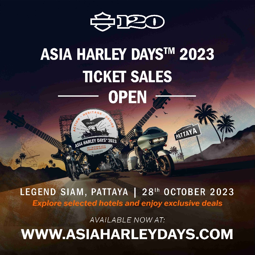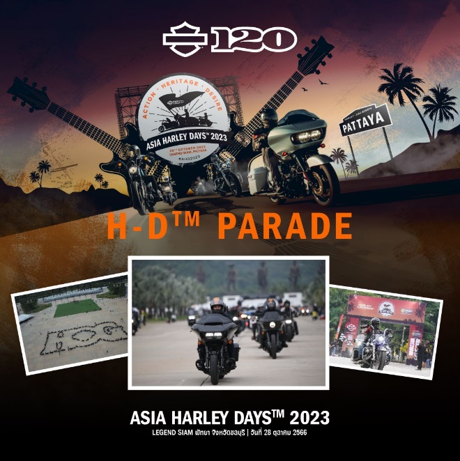 การกลับมาของ Asia Harley Days เทศกาลของคนรักมอเตอร์ไซค์และดนตรีในปีที่ 2 ซึ่งยังตรงกับปีแห่งการเฉลิมฉลองครบรอบ 120 ปีของแบรนด์ Harley-Davidson เตรียมระเบิดความมันส์ด้วยกิจกรรมขบวนพาเหรดของเหล่านักขับขี่ H.O.G.® ในวันที่ 28 ตุลาคม 2566 ณ เลเจนด์ สยาม เวลา 13.00 น. โดยขบวนพาเหรดจะขับผ่านเขาชีจรรย์ หนึ่งจุดแลนด์มาร์คที่งดงามของเมืองพัทยา โดยค่าใช้จ่ายในการเข้าร่วมขบวนพาเหรดจะถูกนำไปมอบเป็นการกุศลให้แก่กิ่งกาชาดอำเภอสัตหีบ ในขณะที่ผู้สนใจเข้าร่วมงานเทศกาล ประตูจะเปิดให้เข้าได้ตั้งแต่เวลา 16.00 น. ถึงเที่ยงคืน