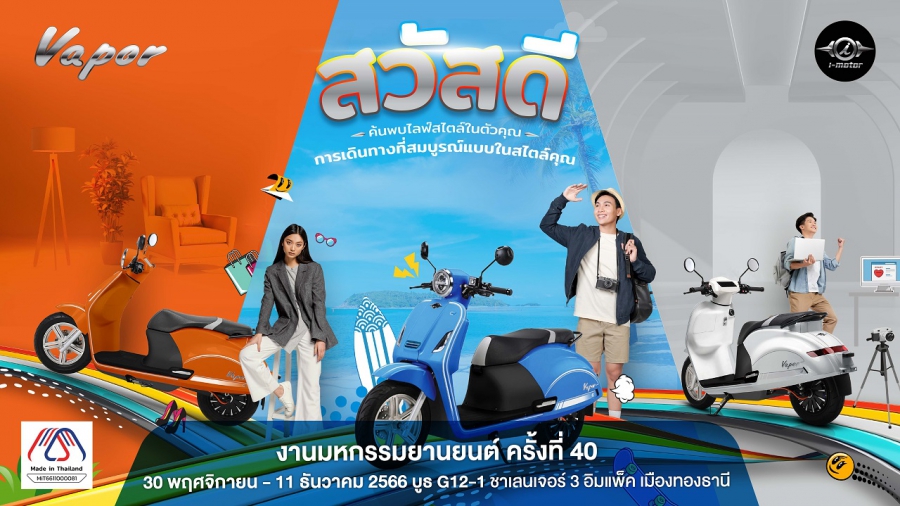 60 ปี พร้อมเตรียมเปิดตัวรถมอเตอร์ไซค์ไฟฟ้า I-Motor รุ่น Vapor CBS ในงานมหกรรมยานยนต์สุดยิ่งใหญ่ Thailand International Motor Expo 2023 ครั้งที่ 40 ณ บูธ I-Motor โซน G12-1 ชาเลนเจอร์ ฮอลล์ 3 อิมแพ็ค เมืองทองธานี ตั้งแต่วันที่ 30 พฤศจิกายน – 11 ธันวาคม 2566 นี้!