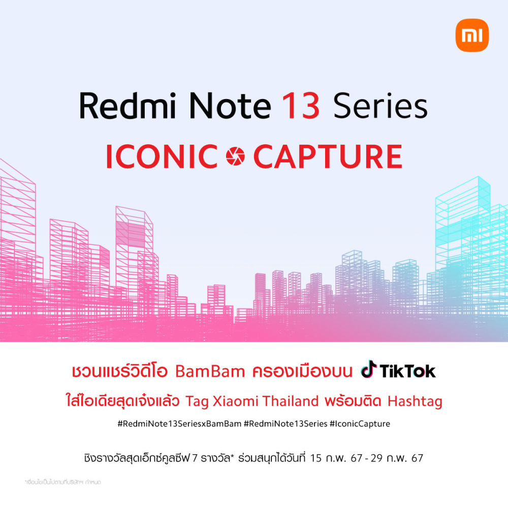 เสียวหมี่ ประเทศไทย จัดกิจกรรมพิเศษ ‘Redmi Note 13 Series ICONIC CAPTURE’ ชวนคุณมาครีเอทคลิปวิดีโอภาพบรรยากาศสื่อโฆษณา Redmi Note 13 Series ที่มีอยู่ทั่วเมือง ความยาวอย่างน้อย 15 วินาที แล้วโพสต์ลงบนช่องทาง TikTok ของคุณ พร้อมติดแฮชแท็ก #RedmiNote13SeriesxBamBam #RedmiNote13Series #IconicCapture แล้ว tag มาที่ Xiaomi Thailand เพื่อลุ้นเป็นผู้ชนะรับรางวัลสุดเอ็กซ์คูลซีฟจากเสียวหมี่* โดยคลิปวิดีโอที่มียอดไลค์สูงสุดจะได้รับสมาร์ทโฟน Redmi Note 13 Pro+ 5G พร้อมลายเซนต์ BamBam แอมบาสเดอร์คนแรกของ เสียวหมี่ อินเตอร์เนชั่นแนล ภูมิภาคเอเชียตะวันออกเฉียงใต้ ภายใต้สมาร์ทโฟนรุ่น Redmi Note 13 Series ไปครอง ผู้ที่สนใจสามารถร่วมสนุกได้ตั้งแต่วันนี้ถึงวันที่ 29 กุมภาพันธ์ 2567 และจะประกาศผลผู้ชนะรางวัลในวันที่ 5 มีนาคม 2567 โดยสามารถดูรายละเอียดและติดตามข้อมูลเพิ่มเติมได้ที่ Facebook Page ของ Xiaomi Thailand