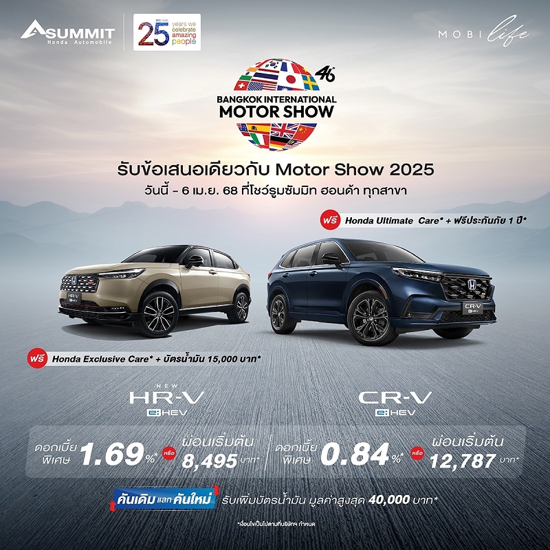 ซัมมิท ฮอนด้า ออโตโมบิล ผู้แทนจำหน่าย รถยนต์ ฮอนด้า อย่างเป็นทางการ ภายใต้บริษัท มิลเลนเนียม กรุ๊ป คอร์ปอเรชั่น (เอเชีย) จำกัด (มหาชน) หรือ MGC-ASIA จัดเต็มความพิเศษ ให้กับลูกค้าที่จองรถยนต์ ฮอนด้า ภายในงาน บางกอก อินเตอร์เนชั่นแนล มอเตอร์โชว์ ครั้งที่ 46 ระหว่างวันที่ 26 มีนาคม ถึง 8 เมษายน 2568 ณ ชาเลนเจอร์ ฮอลล์ 1-3 ศูนย์แสดงสินค้าและการประชุม อิมแพ็ค เมืองทองธานี พร้อมรับข้อเสนอพิเศษ ได้ที่โชว์รูม ซัมมิท ฮอนด้า ออโตโมบิล ทุกสาขา หรือที่บูธ ซัมมิท ฮอนด้า บริเวณชั้น 1 ศูนย์การค้าเมกาบางนา (ใกล้ทางออกเมกาพลาซ่า) ระหว่างวันที่ 26-31 มีนาคมนี้